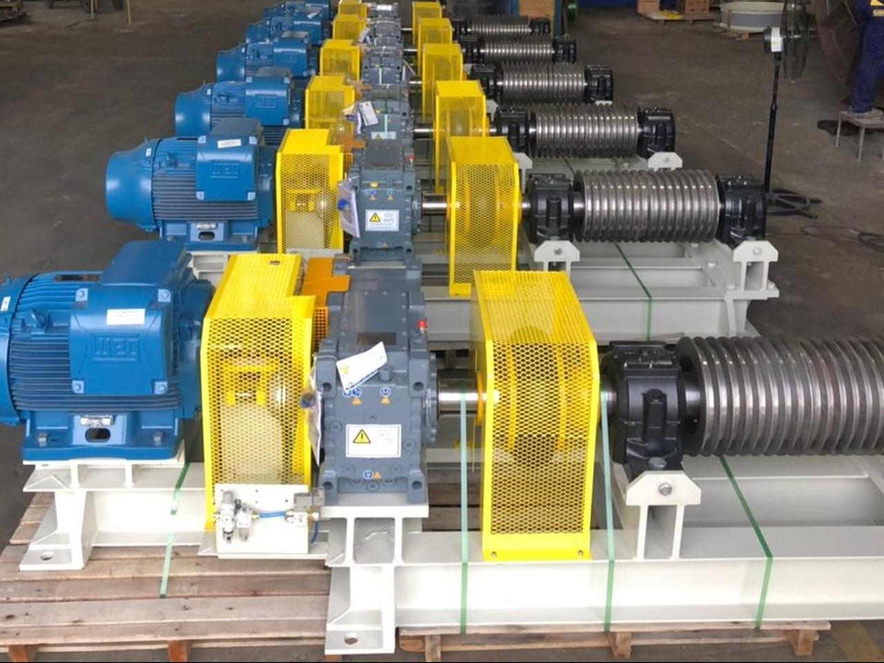 Conjunto de apoio formado por eixos em liga de aço carbono, apoiados em caixas de mancais com rolamentos autocompensadores de rolos.